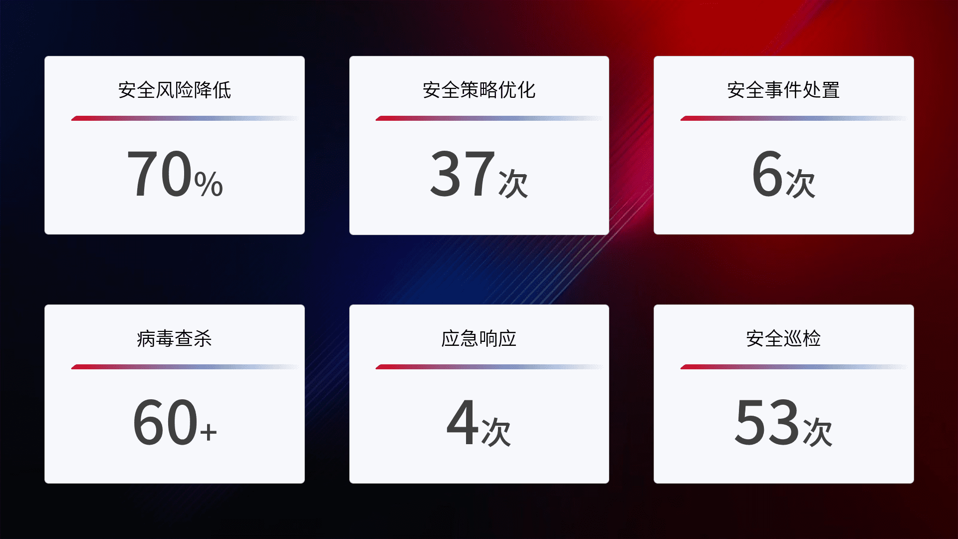 提供全面的安全事件报告体系,,,包括处置报告、、、周报、、季度和年度总结,,结合持续监控,,,帮助客户深入了解网络安全状况。。