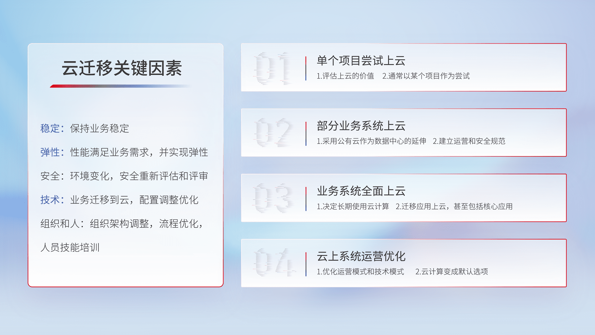 结合实际业务,,,,从规划设计、、、、云平台选型、、、、云原生改造、、、、数据迁移、、、集成交付,,,,迁移全过程为客户识别最佳上云路径,,,做好风险识别管理,,,设计网络架构、、身份权限、、、安全审计合规、、、、操作审计、、、日志审计、、、监控告警策略、、多站点容灾设计等,,,对云上基础设施进行整体规划,,,,提升IT治理水平,,以满足弹性、、高可用、、、高性能的需求。。