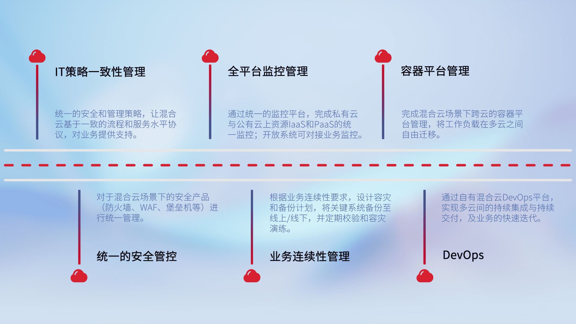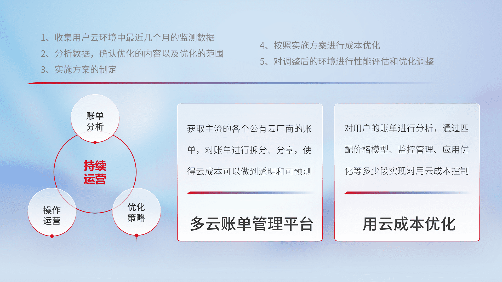 通过多云纳管,,以统一的资源数据模型把客户的云资源进行抽象和封装,,,进而实现对多云资源的统一操作,,保障云资源管理的可靠性、、、、稳定性与可用性。。量身定制化运维内容,,,,配置、、开发运维、、、补丁管理、、备份、、监控、、、认证和访问管理、、、、审计和日常巡检等,,,,保障在用云过程中的可靠度,,,,稳定度以及高可用率。。。。