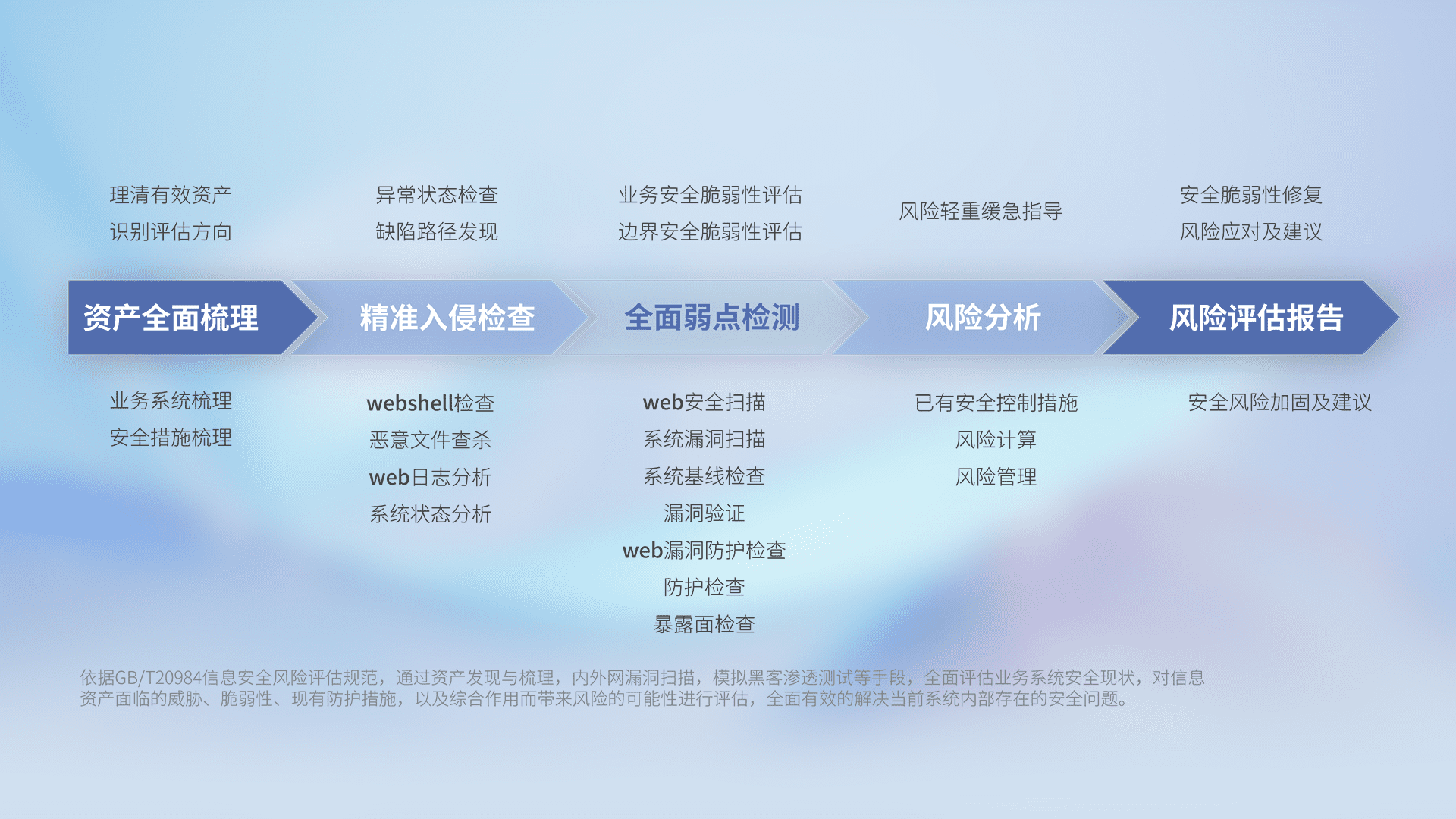 针对客户行业特性,,,以专业的安全服务+多厂商联合解决方案提供专属的一站式安全管理服务,,帮助客户全面感知网络空间威胁,,,基于识别、、检测、、分析、、、防护、、、、监测、、响应的服务理论模型,,,从方案咨询、、集成交付、、、评估验证、、、、优化加固、、运维运营,,致力于为客户提供完整的闭环管理式安全服务。。。以实战经验为客户打造高抵御风险的安全体系,,帮助客户发现威胁、、、、对抗威胁、、处置威胁,,,,不断积累安全对抗能力,,,持续保障数字化安全。。。